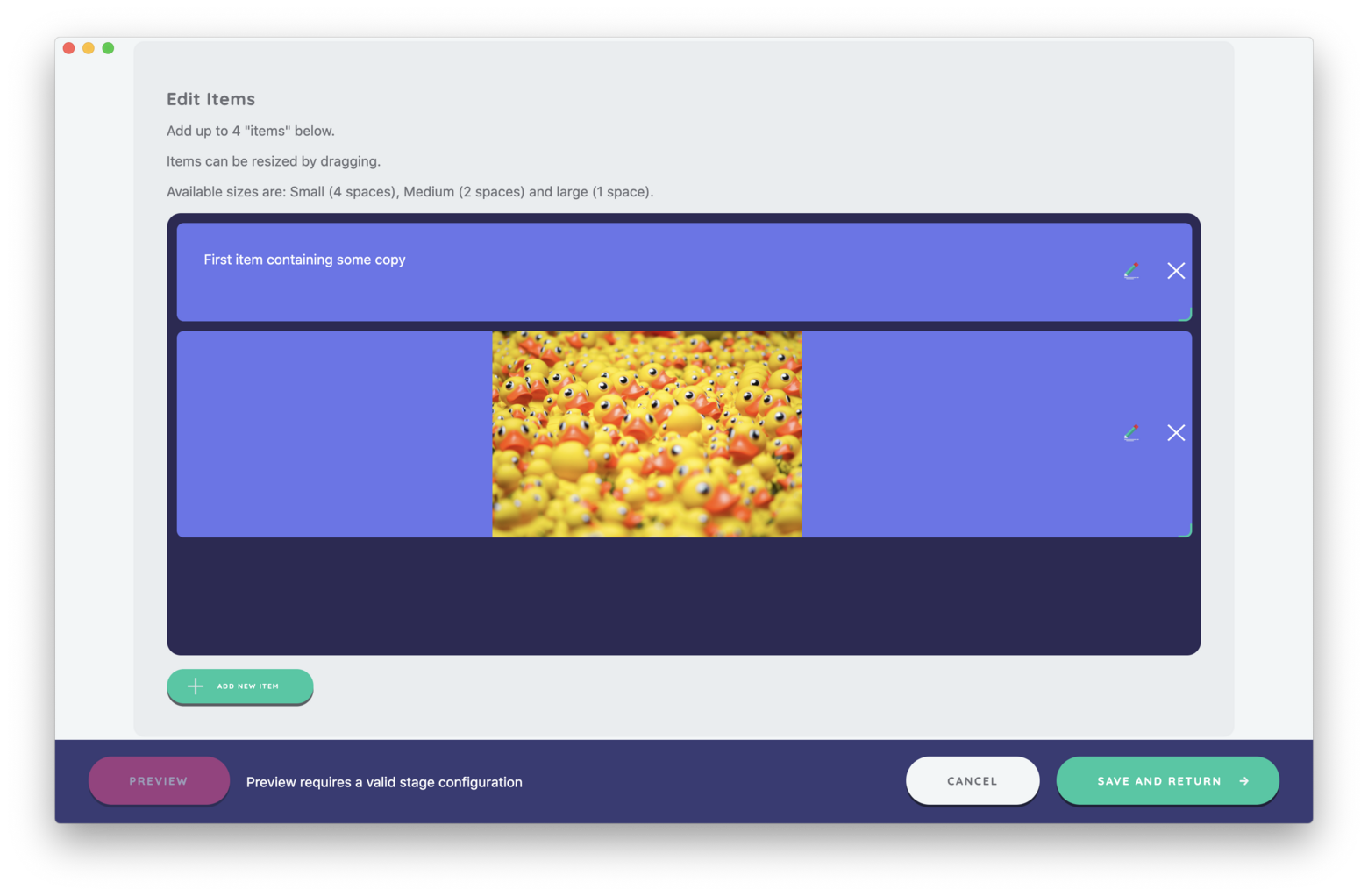 An information screen is made up of a column of 4 spaces for content. These can be text, images, videos and audio. Items can be re-arranged by dragging. Items can be resized to take up 1, 2 or 4 of the available spaces by dragging from the bottom right corner of the item.