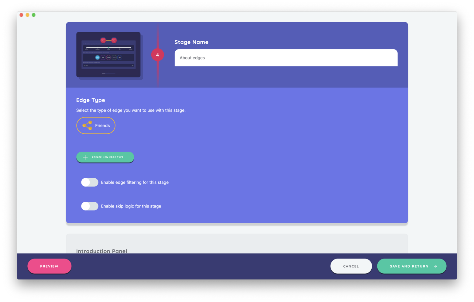 The Per Alter Edge Form is an edge interpreter interface that collects attribute data on the edges, or relationships, between nodes in a participant's network. When using the Per Alter Edge Form, participants review an introductory screen that describes the tasks on the stage and then complete a form for each edge they previously defined between pairs of alters within their network. These forms are customizable and can include one or multiple fields to collect specific edge attribute data.