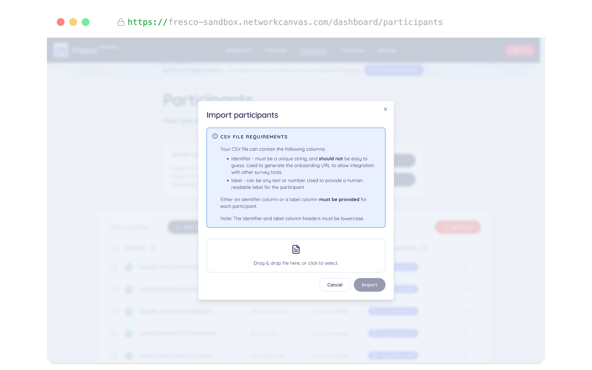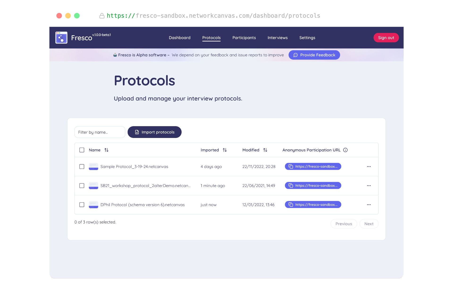 - Upload protocols: Upload one or more Network Canvas protocols created in Architect to Fresco.