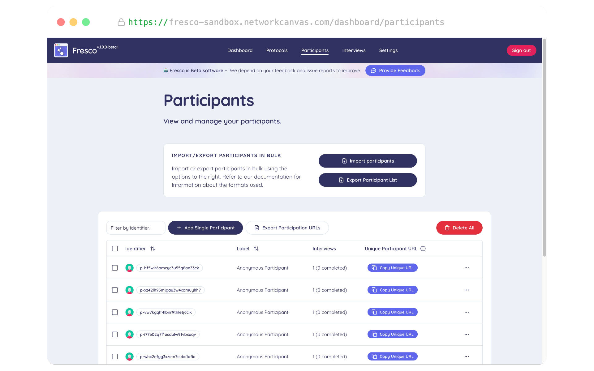 Anonymous recruitment mode allows participants to self-enroll in the study using a unique URL. You can generate this URL for each protocol and share it with participants. When participants visit the URL, Fresco assigns them a random participant identifier and allows them to complete an interview. This method is useful when you do not have a list of known participants or when you want to allow participants to share the study with others.